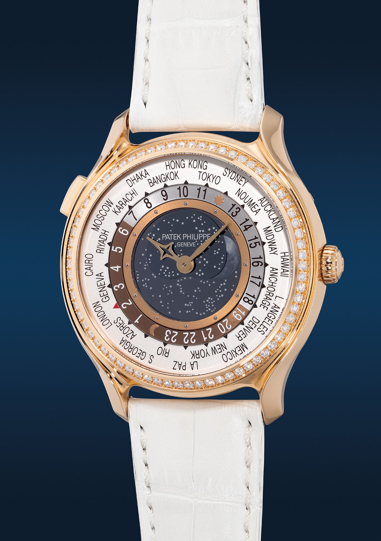 百達翡麗,型號7175R-001,極度精細罕有,限量版女裝玫瑰金鑲鑽自動世界時區月相腕錶,特為百達翡麗175周年紀念限量發行450枚,約2014年製。附錶盒、原裝證書、調整筆、紀念幣