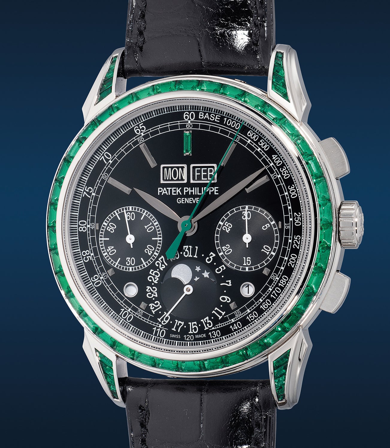 百達翡麗,型號5271/13P-001,極度精細罕有,鉑金祖母綠計時萬年曆腕錶,備閏年、月相、日夜顯示,約2017年製。附錶盒、原裝證書、備用底蓋、調整筆
