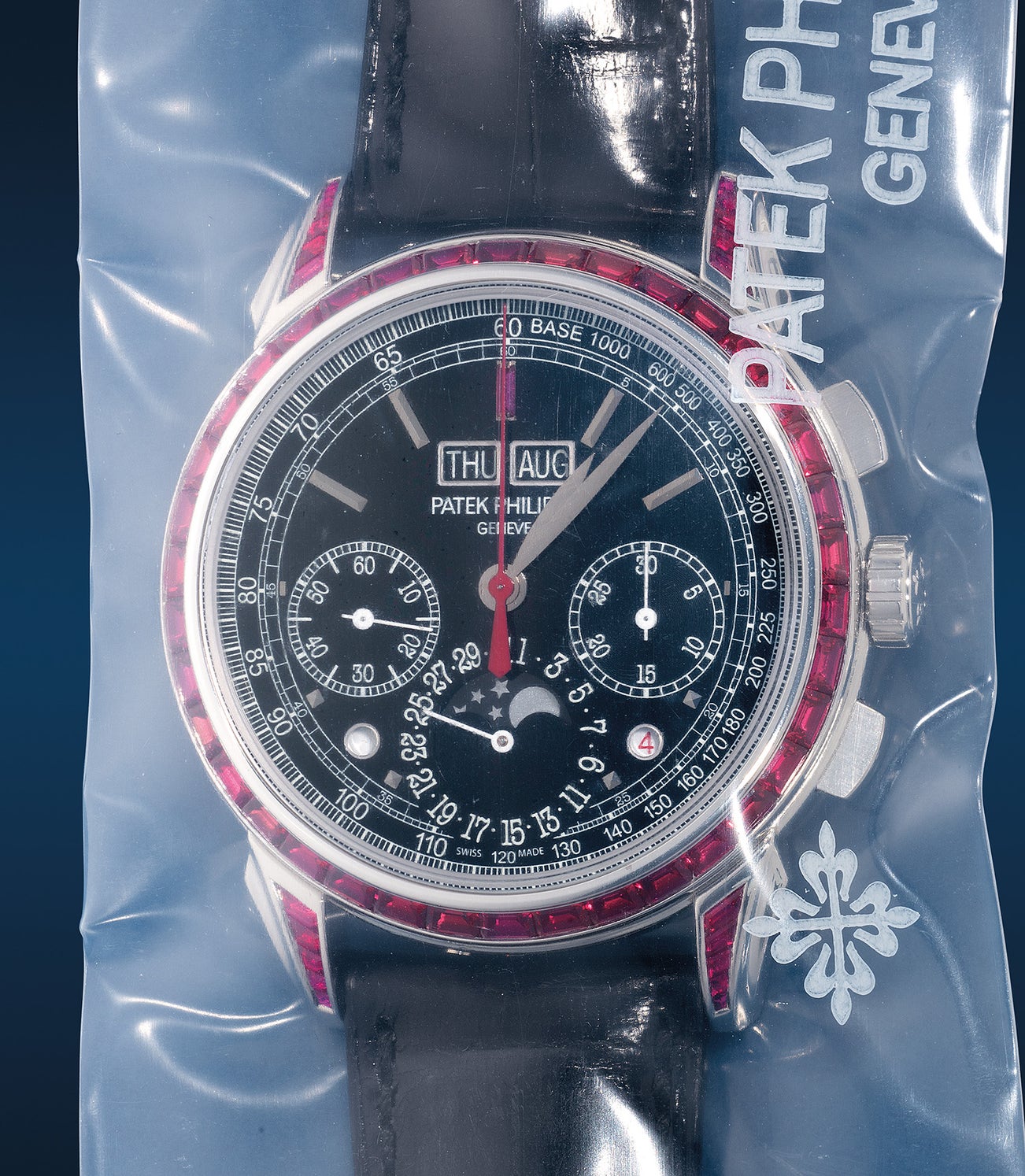 In 2014, the firm released few rare examples of the ref. 5271P with various gem set variants, including emerald, ruby, sapphire and diamonds. The reference was the first to feature a glossy black lacquer dial constructed in twelve layers. They differ from the second series examples of the regular ref. 5270, the dial no longer features the “double chin” at 6 O’clock. The present example set with rubies is one of the most desirable examples of the reference as the pigeon blood red contrasts extremely well against the glossy black dial giving the reference a vibrant appeal.