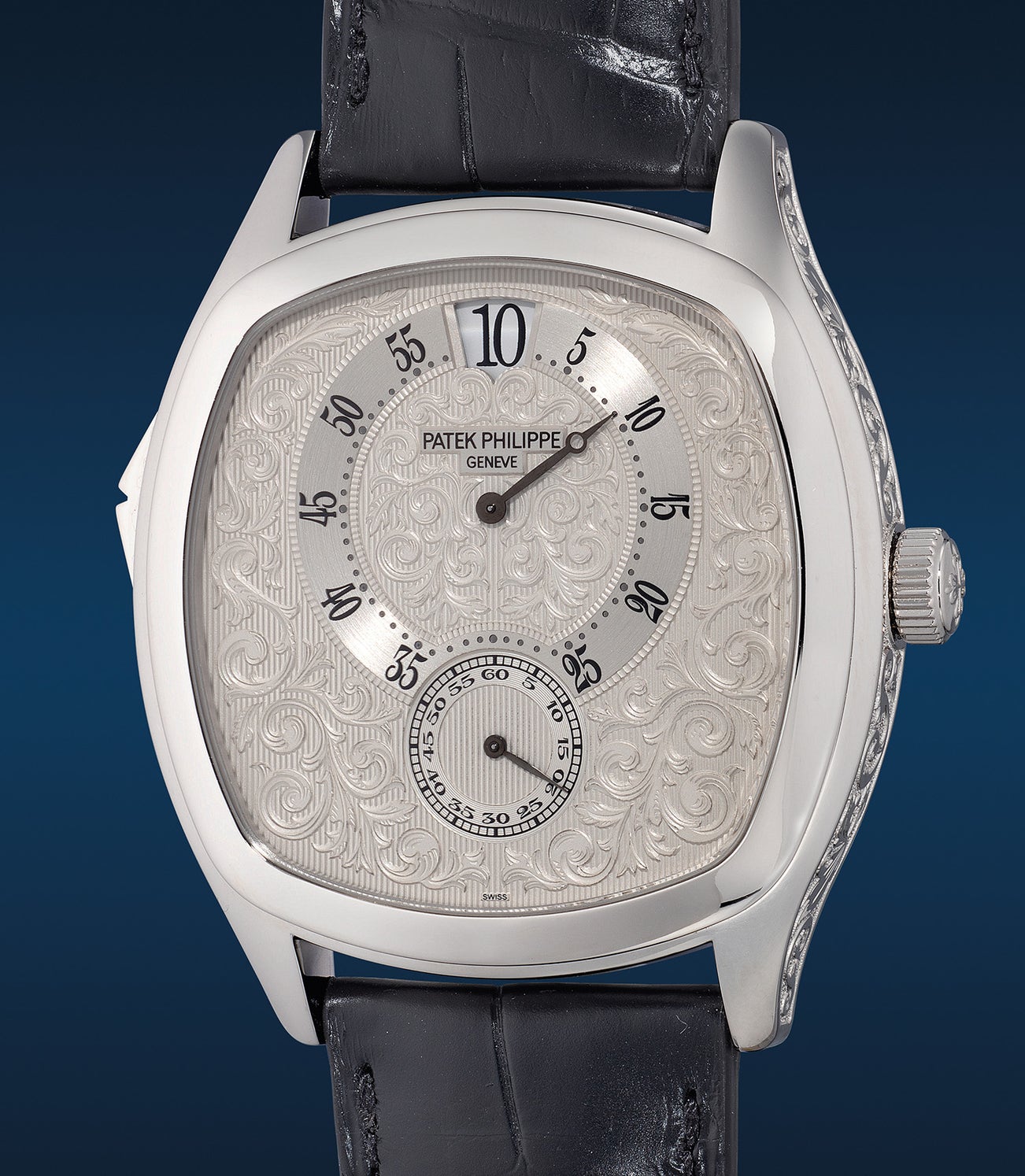 It took Patek Philippe's watchmakers four years to research and develop this complex timepiece. Only 175 examples were produced, with the platinum case and dial engraved in a floral scroll motif. The motif elegantly adorns the otherwise empty dial and extends to the case sides and clasp.