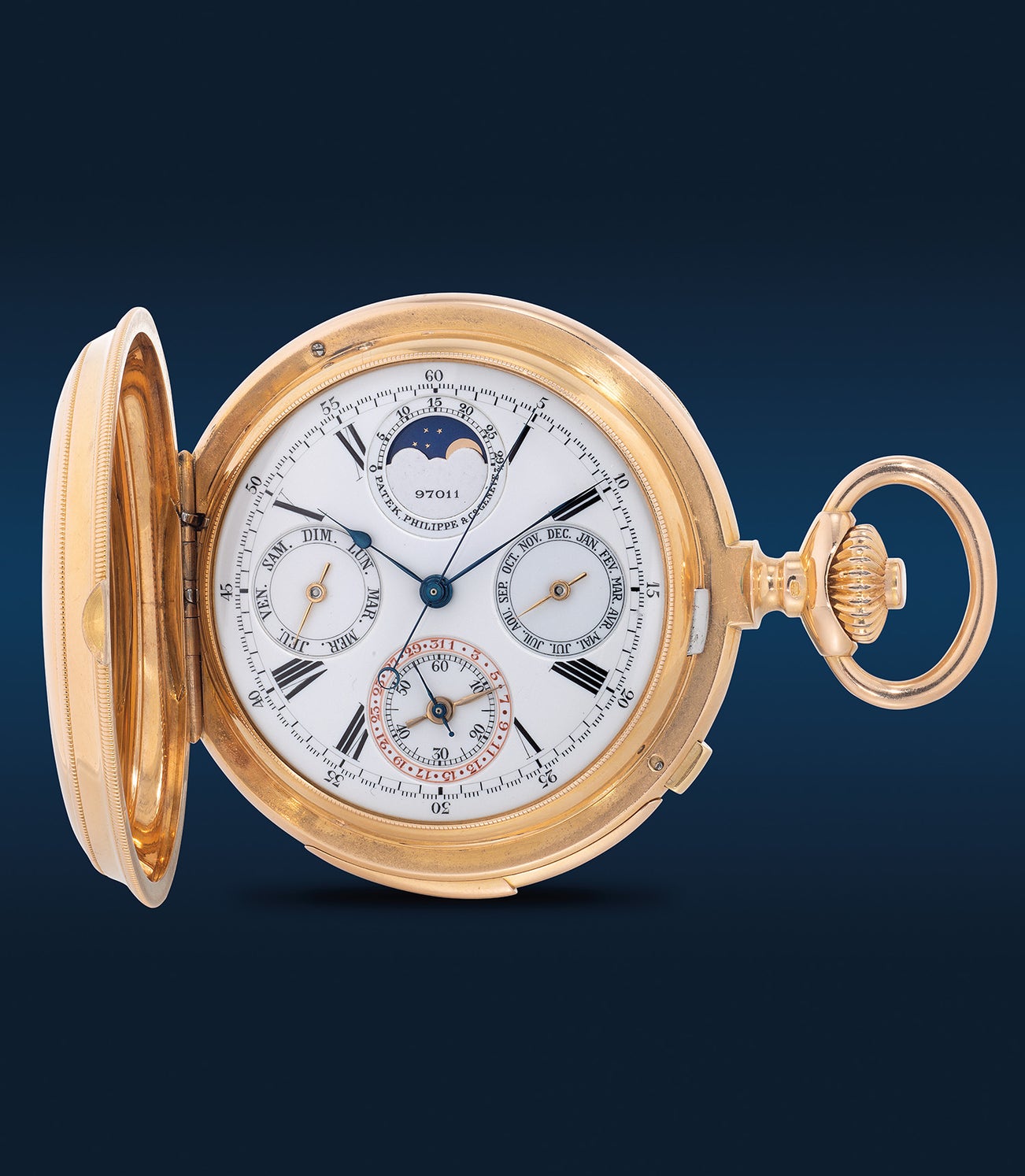 The genesis of these marvels can be traced back to achievements like those seen in this breathtaking pocket watch from 1892. This 19th Century exquisite pink gold minute repeating perpetual calendar chronograph pocket watch exemplifies Patek Philippe's mastery. Its sublime chimes ring clear and true, allowing one to tell the time even in darkness. The elegant enamel dial features a moon phase indicator, month and week indication in French, red date display, and small seconds subdial.