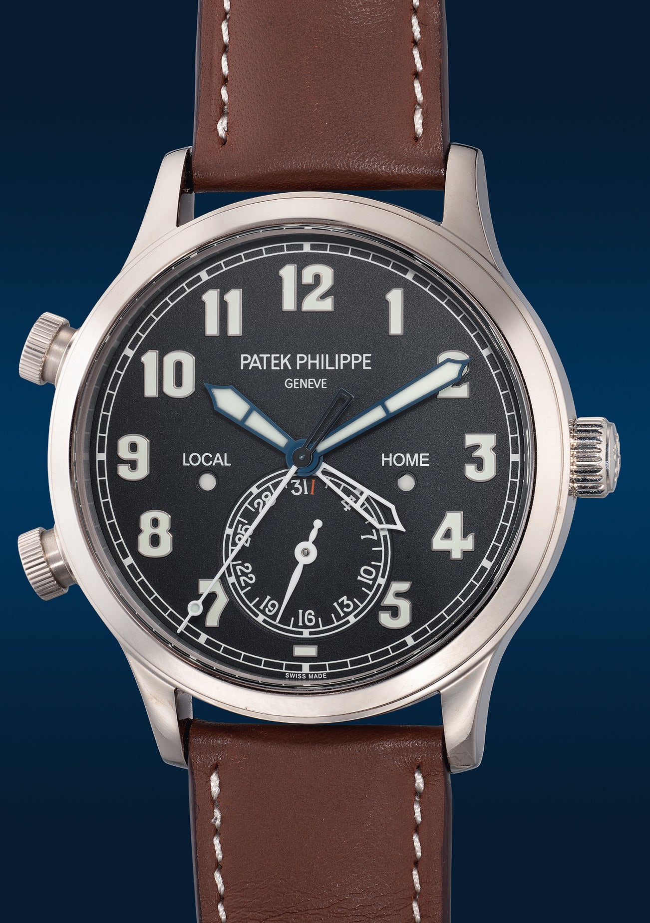 百達翡麗,「 Calatrava Pilot Travel Time 」型號5524G-001,精細,白金自動兩地時區腕錶,備中心秒針、日期、日夜顯示,約2017年製。附原裝證書、錶盒、調整筆