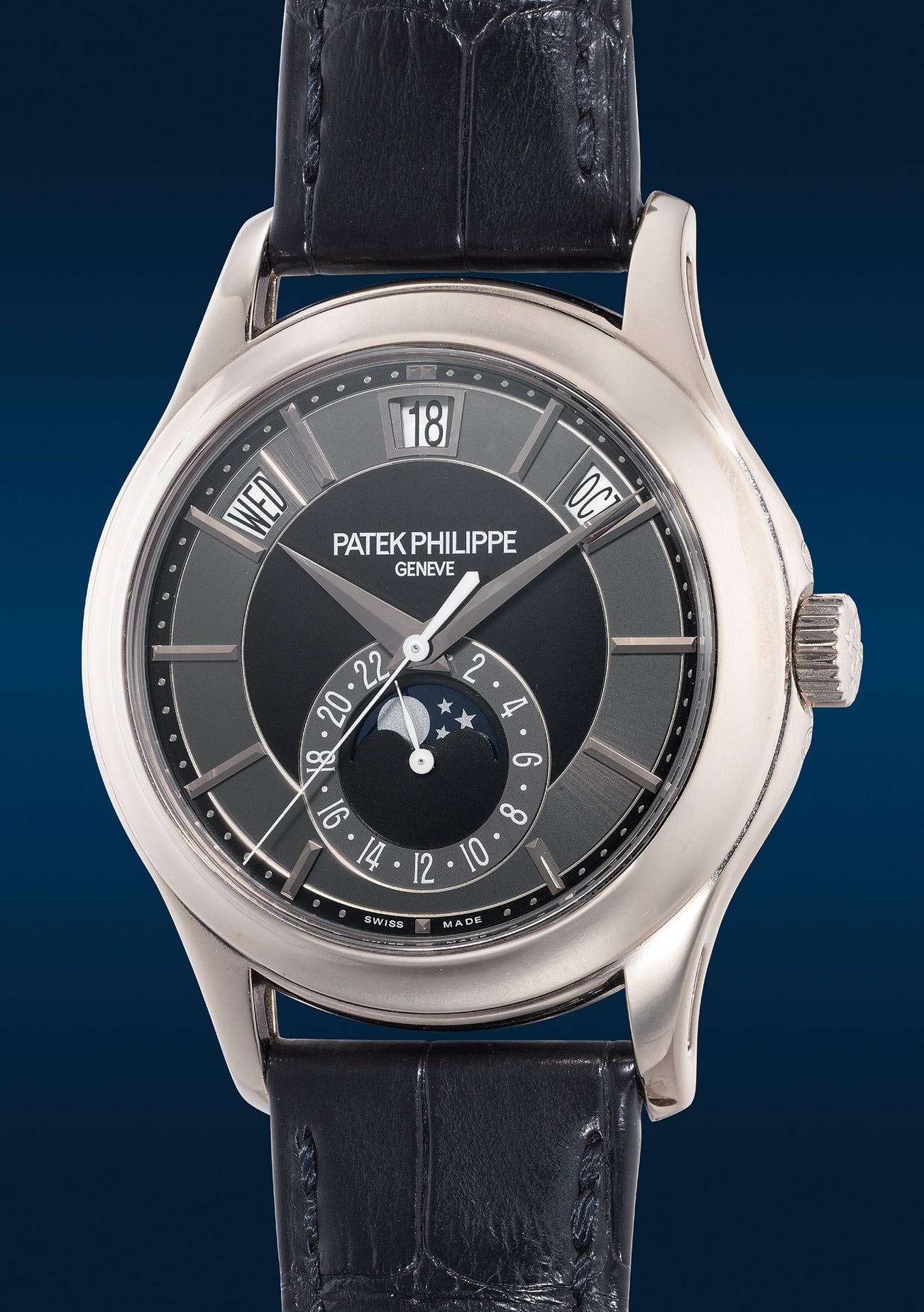 With its elegant 40mm case, concave bezel and distinguished hollowed lugs, the ref. 5205 pioneered annual calendar prestige. This particular white gold example exhibits a striking slate grey and black dial perfectly complementing the case metal. Offered in excellent condition, the watch also comes with its presentation box.