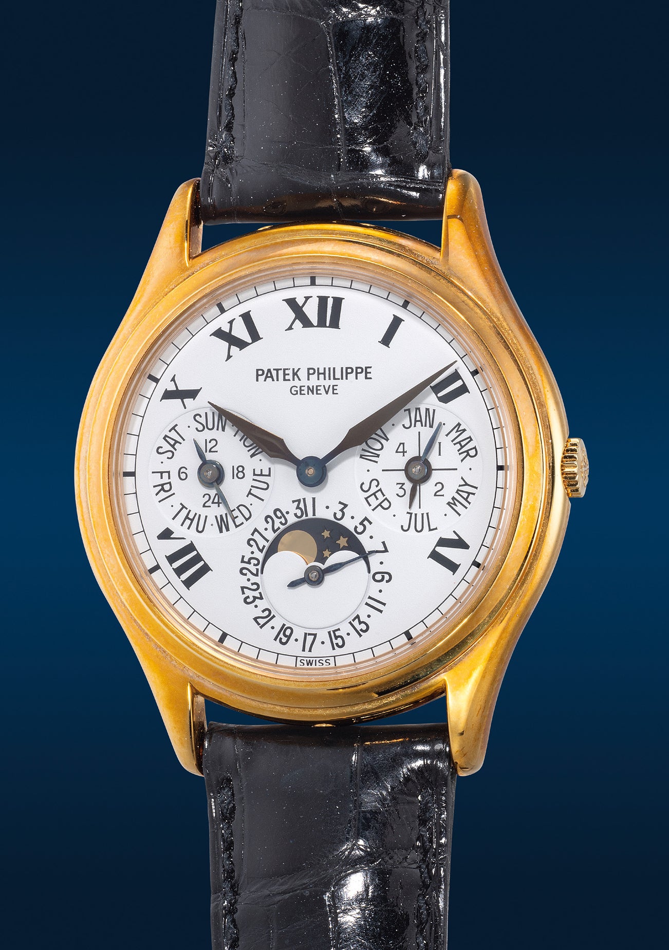 百達翡麗,型號 3940J-022,精細優美,黃金自動萬年曆腕錶,備閏年、月相、24小時顯示,約2001年製。附原裝證書、底蓋、調整筆、錶盒