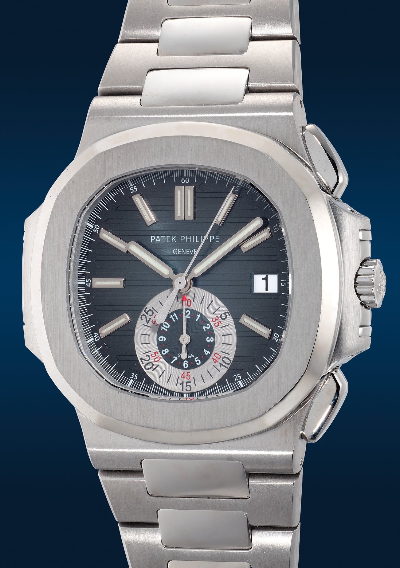 百達翡麗,「Nautilus」 型號5980/1A-001,精細,精鋼自動飛返計時鏈帶腕錶,備日期顯示,約2010年製。附原裝證書、錶盒、調整筆