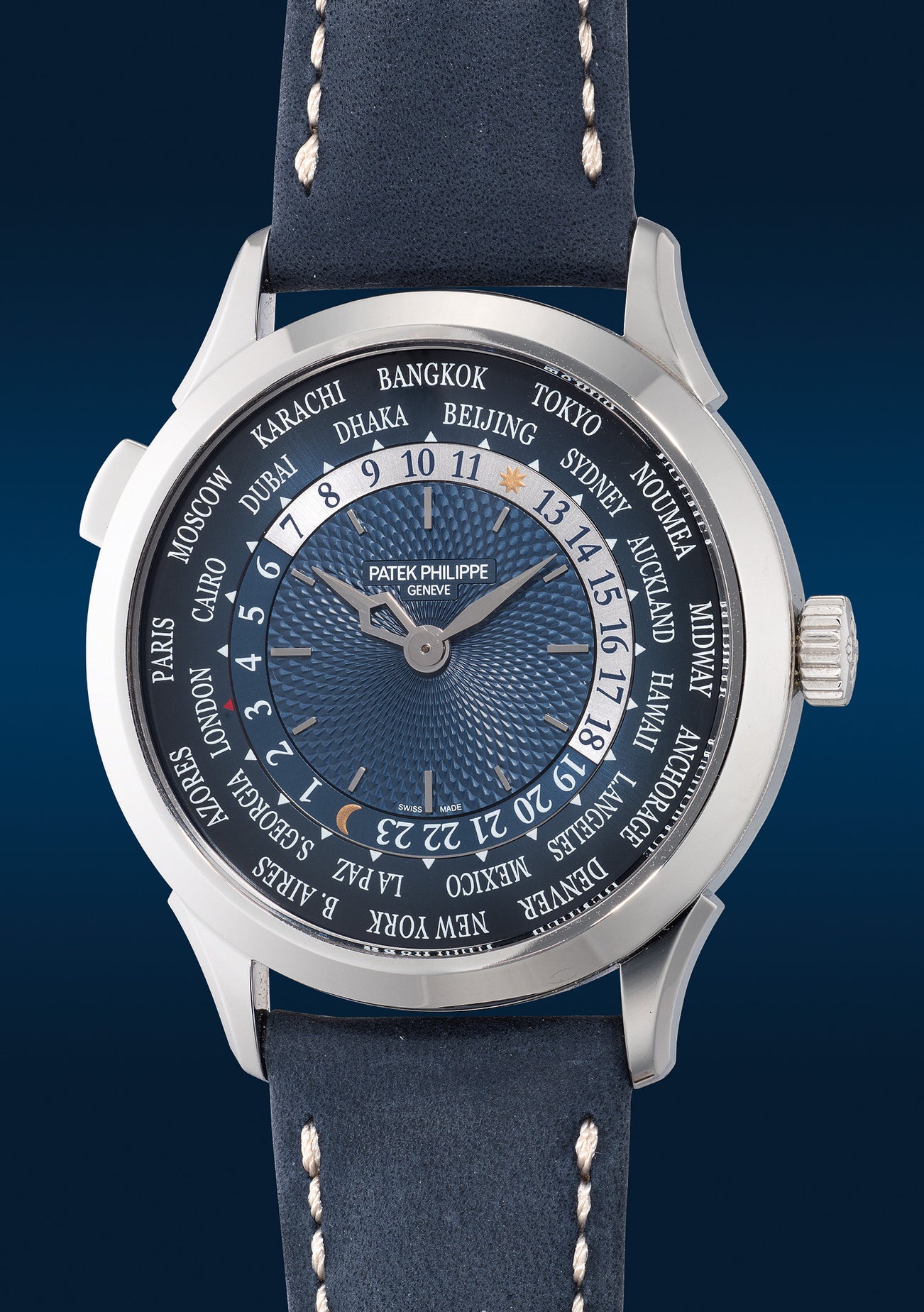 In 2022, Patek Philippe introduced three new world time wristwatches at Watches & Wonders: ref. 5231G-001 with Cloisnée enamel dial featuring Australia, ref. 7130R-014 with green dial and diamond-set bezel, and last but not least, the ref. 5230P-001, the platinum world time with a new blue on blue look. Sized at a perfect 38.5mm diameter platinum case, the azure blue dial is aesthetically striking. Highly sought after, Patek Philippe just discontinued the ref. 5230P-001 this year, giving this reference a short production period. The first example to be auctioned at Phillips and fresh-to-the-market, the present ref. 5230P is in “like-new” condition and accompanied by its original Certificate of Origin and accessories. Time to strap on this handsome timepiece and hop on the plane for your next trip.