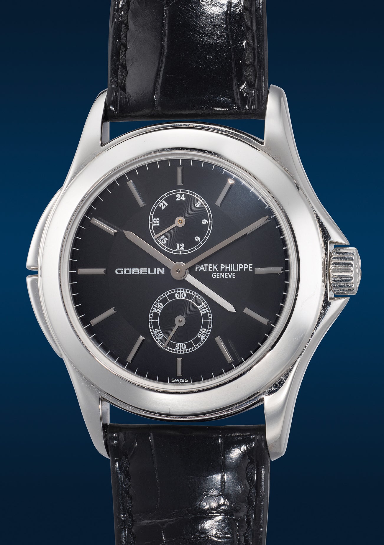 The present platinum variant is the rarest of all. Featuring a striking black dial, it exudes superb elegance where the silver print and subtle finishing on the dial harmonize beautifully with the white gold hour markers and silvered second-time-zone hand. Turning the watch over, the caseback continues to pay tribute to Gübelin's heritage by proudly presenting the inscription "GÜBELIN 1854 - 2004" encircling the Patek Philippe movement.