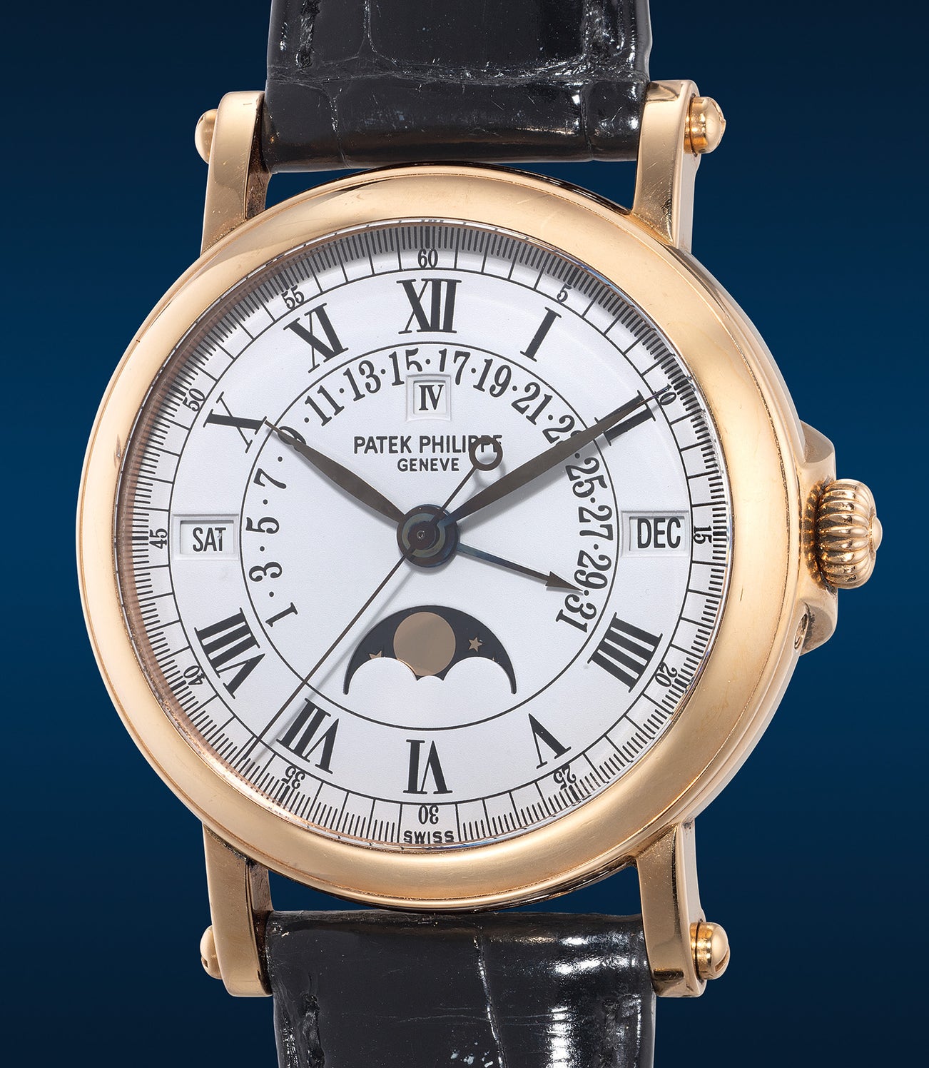 百達翡麗,型號5059R-011,精細,玫瑰金自動萬年曆腕錶,備軍官式後蓋、逆跳日期、中心秒針、閏年、月相顯示,約2000年 製。附原裝證書、錶盒