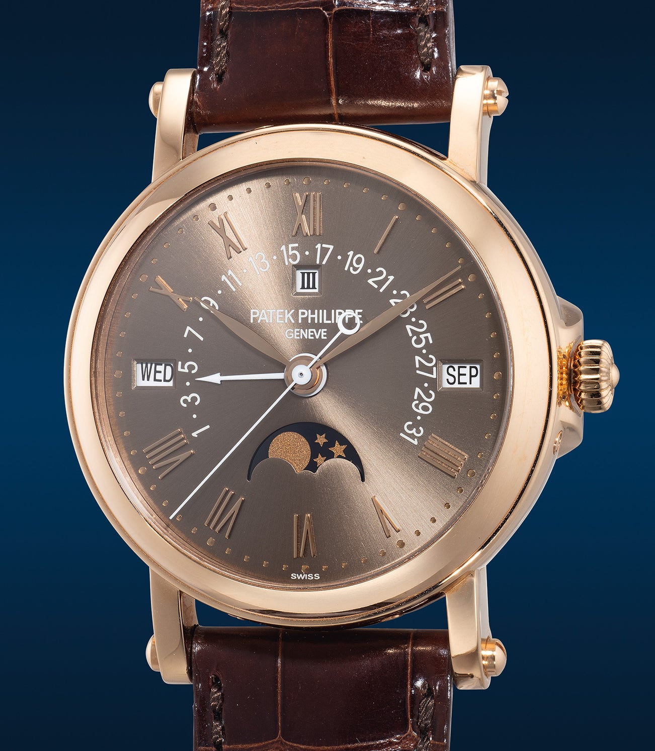 百達翡麗,型號5059R-017,十分精細罕有,玫瑰金自動萬年曆腕錶,備棕色錶盤、將官式後蓋、逆跳日期、中心秒針、閏年、 月相顯示,2019年製。附原裝證書、調整筆、錶盒、配件