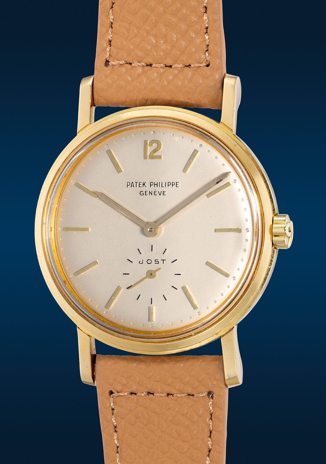 百達翡麗,型號 「3435」,精細罕有,黃金自動腕錶,備小秒針,由意大利錶商 Jost 銷售,約1962年製。