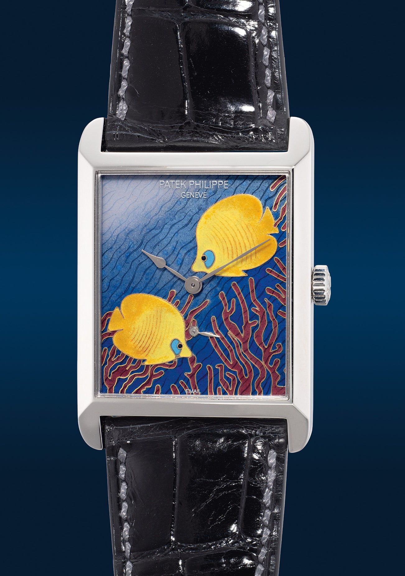 Launched in 2003, the ref. 5076 presented an array of enamel dial designs, commonly in series of four depicting boats, fish or zodiacs. The present example depicts a pair of Bluecheek Butterflyfish swimming peacefully amongst an intricately shaped coal reef, vividly evoking the tropical waters. Glistering under the sea, shades of blue, yellow and red come alive through the delicate cloisonné wires of gold.