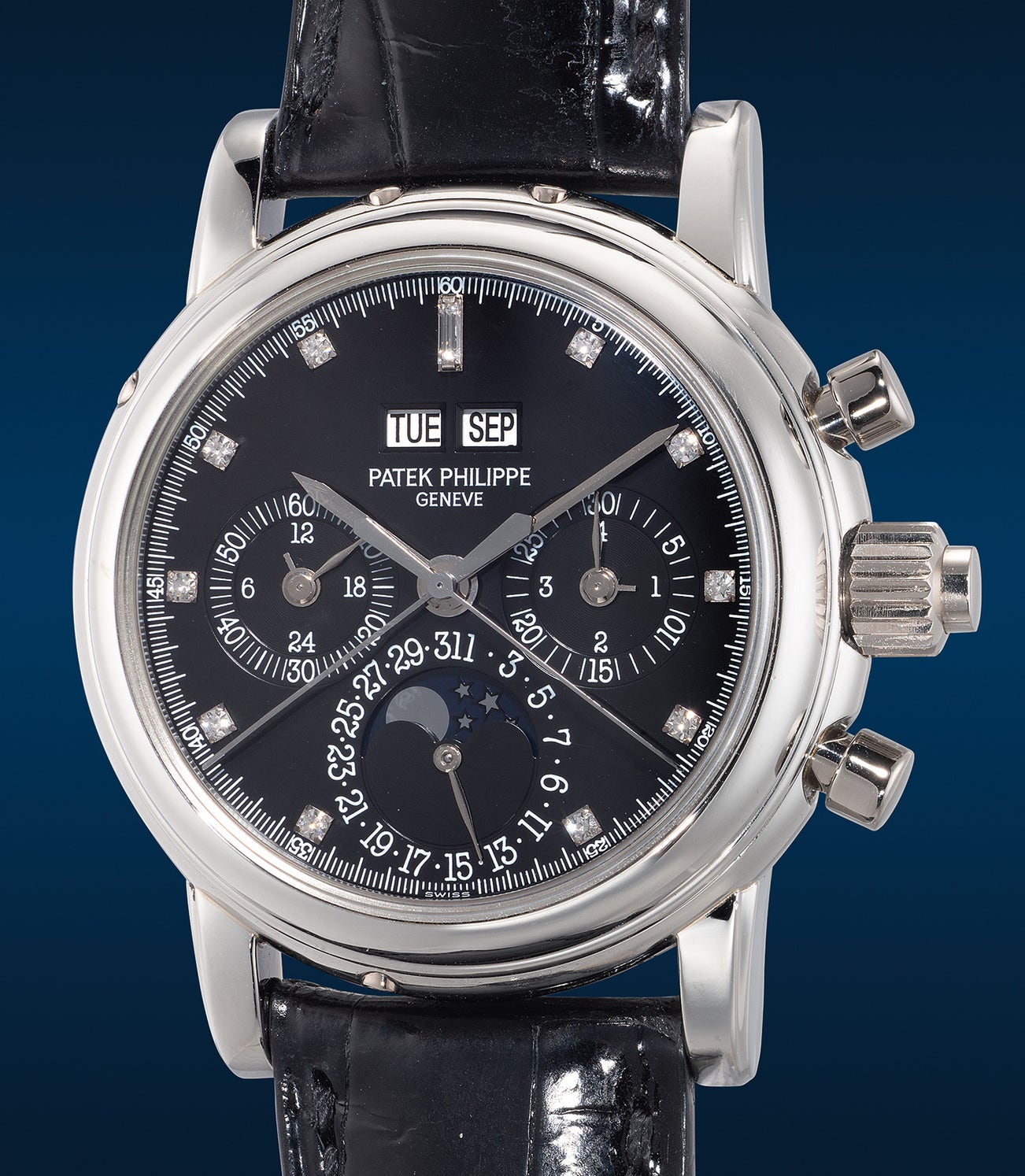 百達翡麗,型號5004P-033,極度複雜罕有,鉑金萬年曆追針計時腕錶,備鑽石時標、月相、閏年、日夜顯示,約2006年製。附原裝證書、錶盒、備用底蓋、調整筆