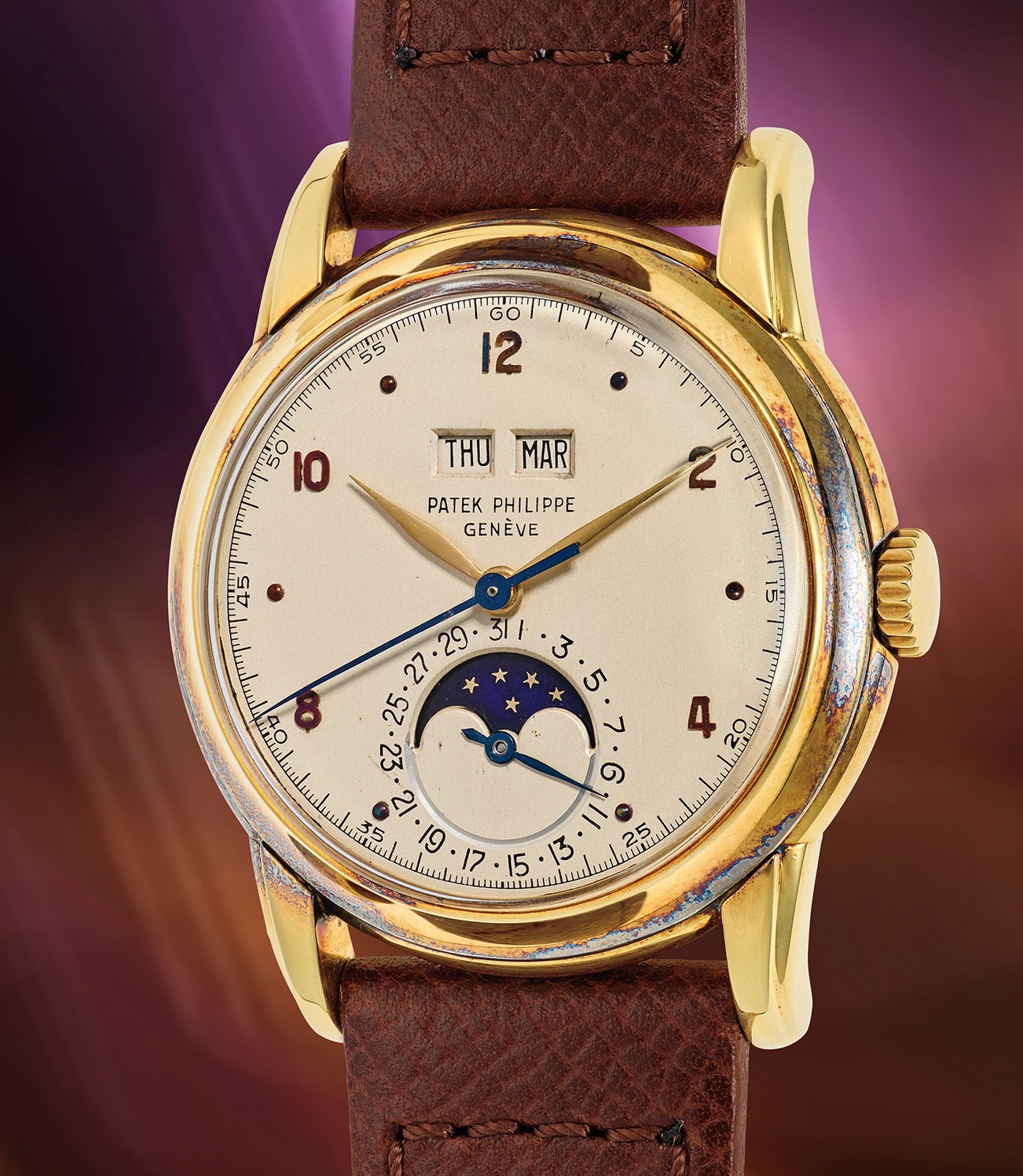 百達翡麗,早期、極為精細、罕有,黃金萬年曆腕錶,備中心秒針及月相顯示。