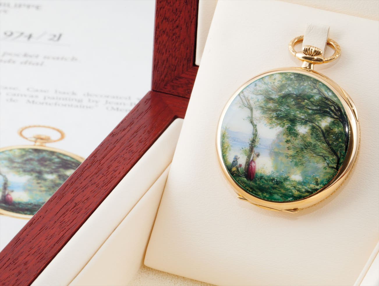 An exceptional and unique openface yellow gold keyless lever watch with enamel miniature painted by Suzanne Rohr, after an 1864 painting by Jean-Baptise Camille Corot