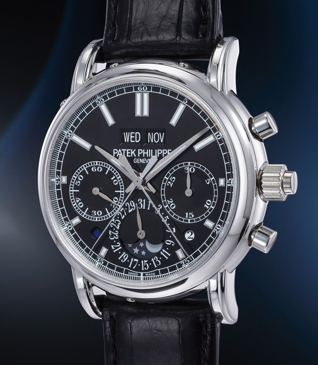 百達翡麗,非常精細,鉑金萬年曆追針計時腕錶,備月相、閏年、日夜顯示。附備用底蓋、原裝證書、錶盒