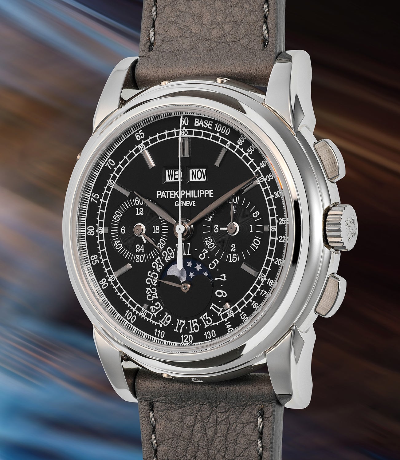 百達翡麗,極度精美,鉑金萬年曆計時腕錶,備月相、24小時、閏年顯示。附原裝證書及錶盒