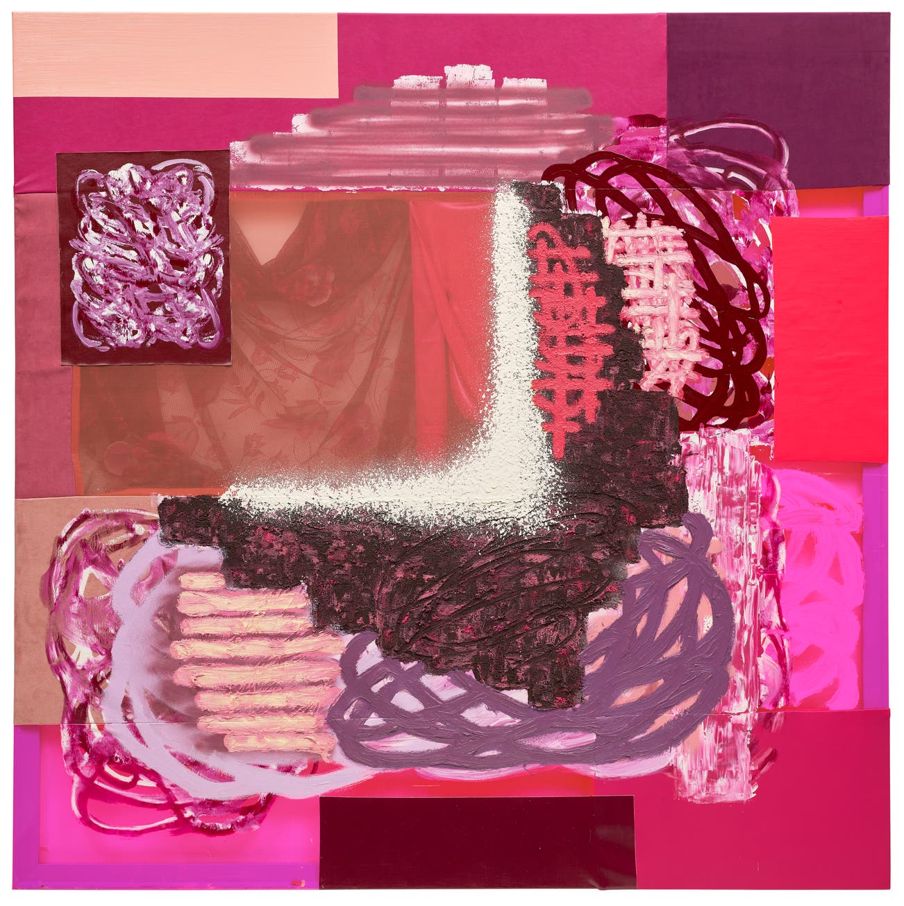 acrylic, enamel, oil, oil stick and spray paint on sewn fabric and vinyl