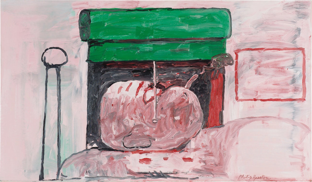 Evocative of Albrecht Dürer’s Melencolia I, 1514, a reproduction of which he had taped on the wall of his Woodstock studio, Smoking II portrays the solitude, depression, and melancholy that Guston experienced in the last decade of his life. Robert Storr recalled that during this time Guston used to always quote a remark John Cage said to him in the 1950s: “When you are working, everybody is in your studio—the past, your friends, the art world, above all your own ideas—are all there. But as you continue painting, they start leaving, one by one, and you are left completely alone. Then, if you are lucky, even you leave” (Philip Guston, quoted in Robert Storr, Philip Guston, New York, 1986, pp. 62-63). It is ironic, then, that in the face of the most intense, excruciating loneliness he had felt in his life thus far, Smoking II did not empty out but rather became replete with the iconography and pictorial decisions from his past. While the subject matter—Guston in bed, unable to sleep—harkens back to Sanctuary, 1944, Estate of Philip Guston, the pervasive delicate pink tones freckled with scarlet can be linked to his early abstractions, such as Dial, 1956, Whitney Museum of American Art, New York. More recently, the smoke, green window shade, and ambiguous red frame were staple motifs of his Klan hood paintings executed four or five years beforehand, such as The Studio, 1969, Louisiana Museum of Modern Art, Humlebæk, Denmark.