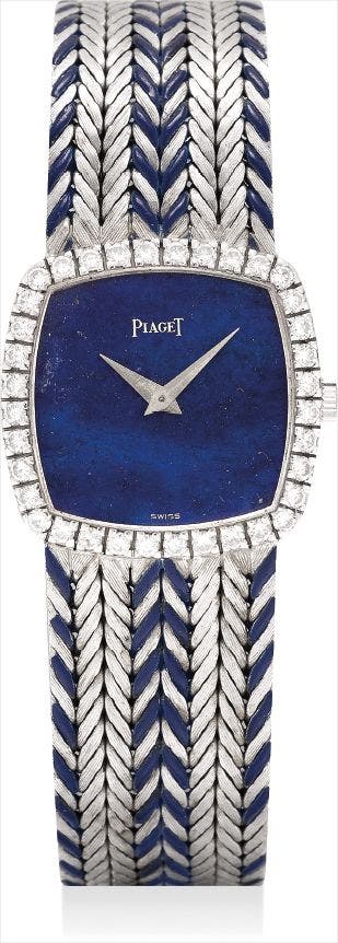 伯爵,18K白金鑲鑽石及琺瑯枕形鏈帶腕錶,配青金石錶盤,型號9236 E14,1969年製
