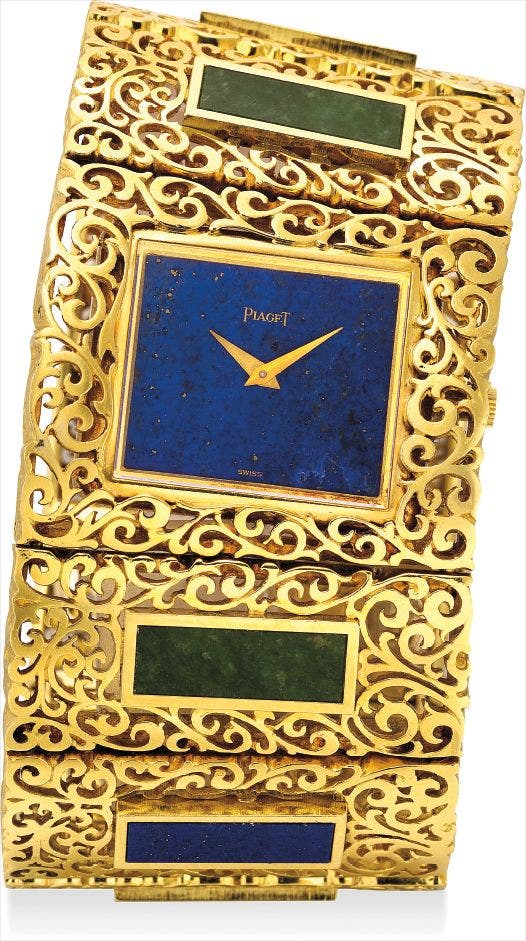 伯爵,極罕有及非常獨特,18K黃金鑲玉石及青金石鏈帶腕錶,型號9150 D46,1971年製
