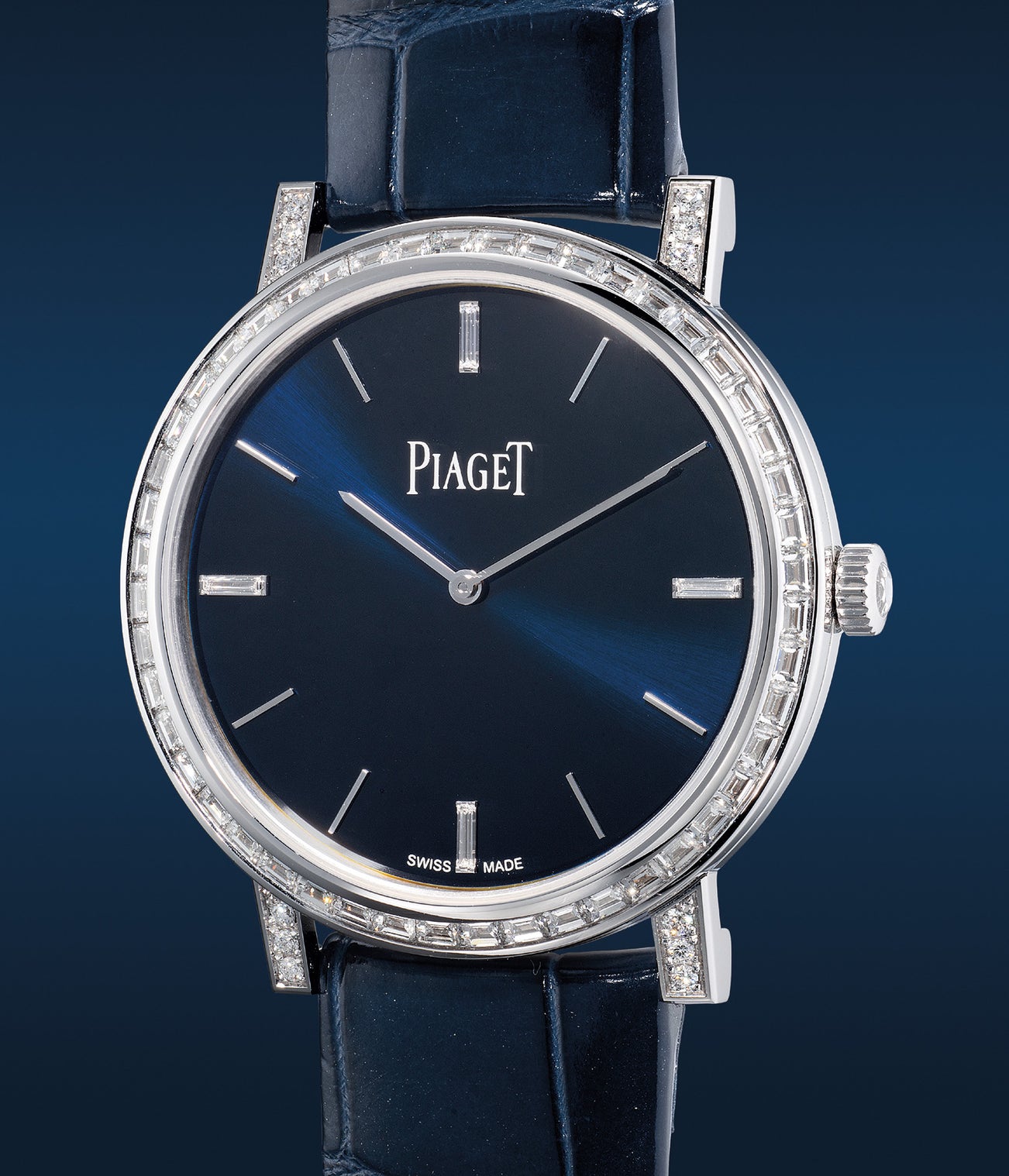 The present Piaget Altiplano belongs to a limited edition of 88 pieces featuring a charismatic bezel set with baguette-cut diamonds on a 36mm diameter case. The lugs are further set with brilliant-cut diamonds that complement the baguette-cut diamond indexes against its mesmeric deep blue dial. Offered in excellent overall condition with extremely minimal signs of use and wear. The present example numbered 42 from circa 2021 is complete with its full set of accessories including its original warranty and presentation box.