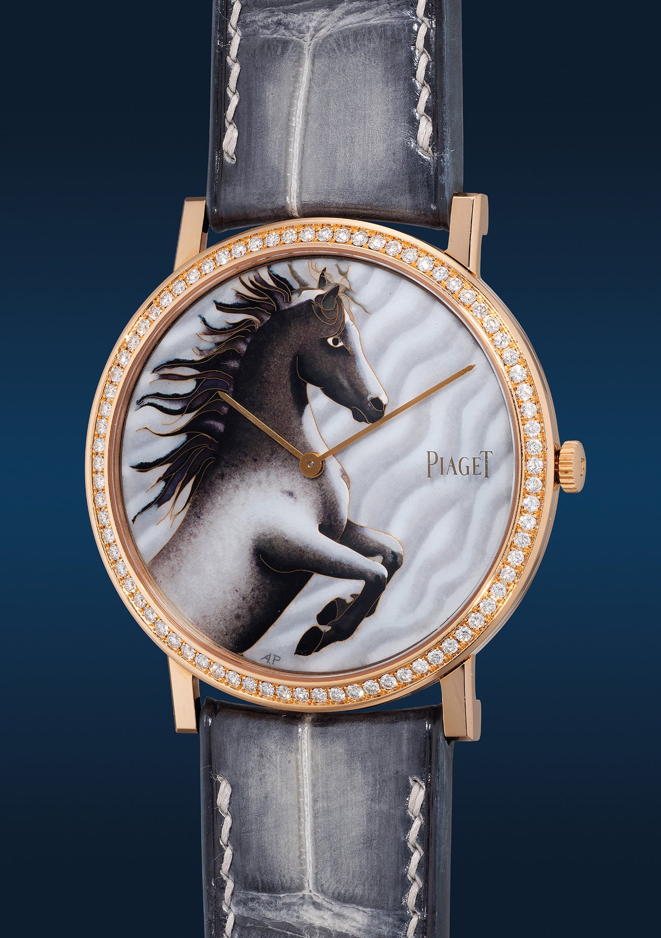 At 6 o’clock of the dial, one can recognize the signature of Anita Porchet, one of Switzerland’s most respected and renown enamellers. The cloisonné enamel technique is completed by the deposit of material into the empty windows separated by gold wire fixed in a distinct pattern, before a firing and glazing process. Each hollow is dedicated to a separate colour, and the firing process can take several attempts to achieve the desired potency. The timepiece is powered by the manual-wound Piaget Altiplano 430P movement and jewels, has a 43-hour power reserve, and is finished with a circular Côtes de Genève. It is complete with its warranty and original accessories. The artistry and detail behind this rare piece make for a special addition to a collection of an equestrian lover or to commemorate one’s zodiac year.