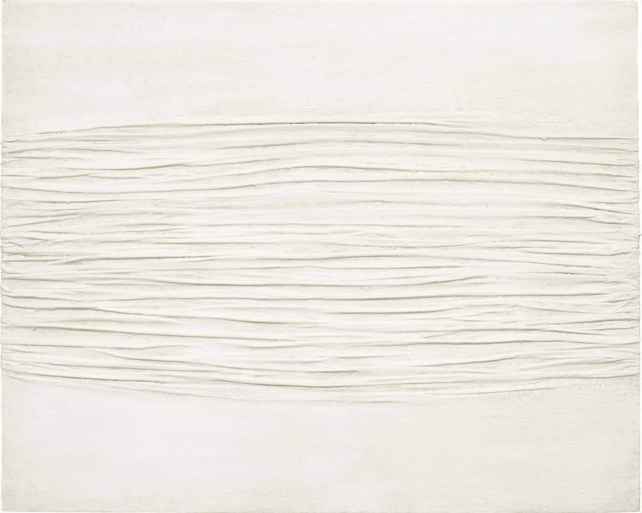 Performing one of the most revolutionary conceptual gestures of contemporary art, Manzoni radically depersonalised his paintings, conceiving them as self-generating and autonomous, free from external influence. Subjectivity was banished in favour of the object itself. Manzoni accomplished his visionary aim through the use of kaolin, a soft china clay originally employed in porcelain manufacture. To create Achrome, he first glued the canvas into an arrangement of folds and creases and then applied the chalky white kaolin solution on it. During the drying process, the kaolin enhanced the sculptural plasticity of the surface undulations, allowing the painting to achieve its final state without Manzoni's intervention. Achrome appears as a plain white monochrome, interrupted by a vibrant horizontal band of sculptural folds and recesses. Manzoni allows these pleats to recall the drapery of classical and Renaissance statuary, his kaolin evoking the solidity of marble while retaining the fragility of plaster. In this way, Achrome is suffused with a materiality that is entirely its own.