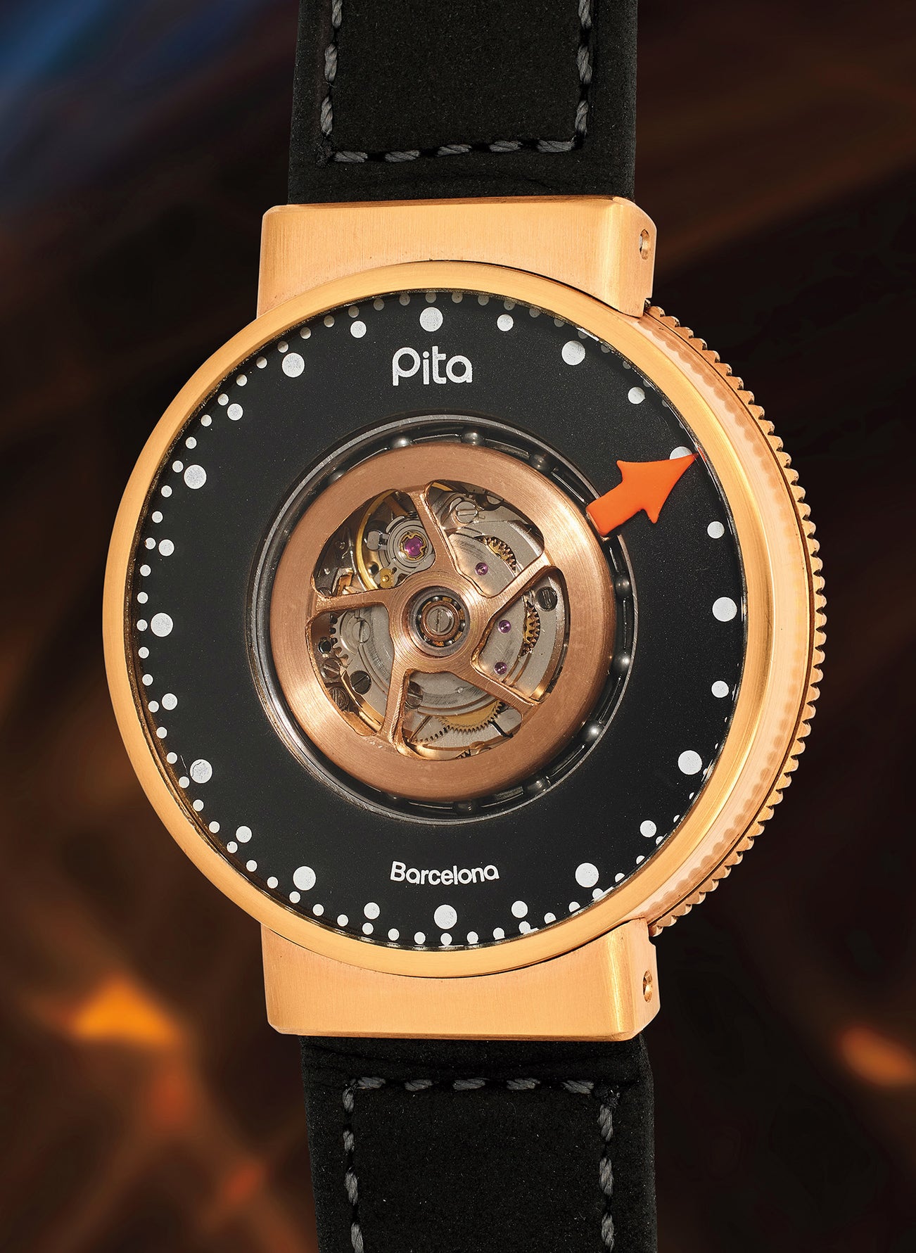 The Carousel, crafted by Aniceto Jiménez Pita—a self-taught independent watchmaker and AHCI member since 2006—is one of eight models that Pita has introduced for his namesake brand. The Carousel embodies innovative horology and hand-craftsmanship, with its movement uniquely rotating on its axis via ball bearings, completing one revolution every 12 hours. The inverted design of the movement reveals the skeletonized winding rotor on the dial side, which is shaped like a driver’s wheel. In addition, Pita’s own patented Time-Setting Mechanism eliminates the crown, allowing for adjustments by rotating the case back and greater comfort.