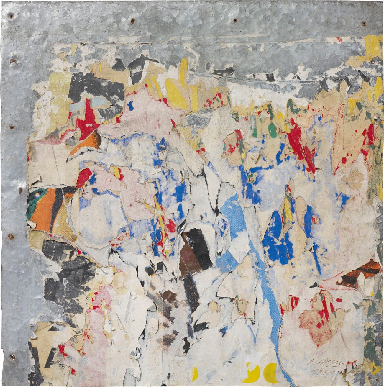 Signed and dated 'R. Hains 1961' lower right; further signed and dated 'Raymond Hains 1961' on the reverse.