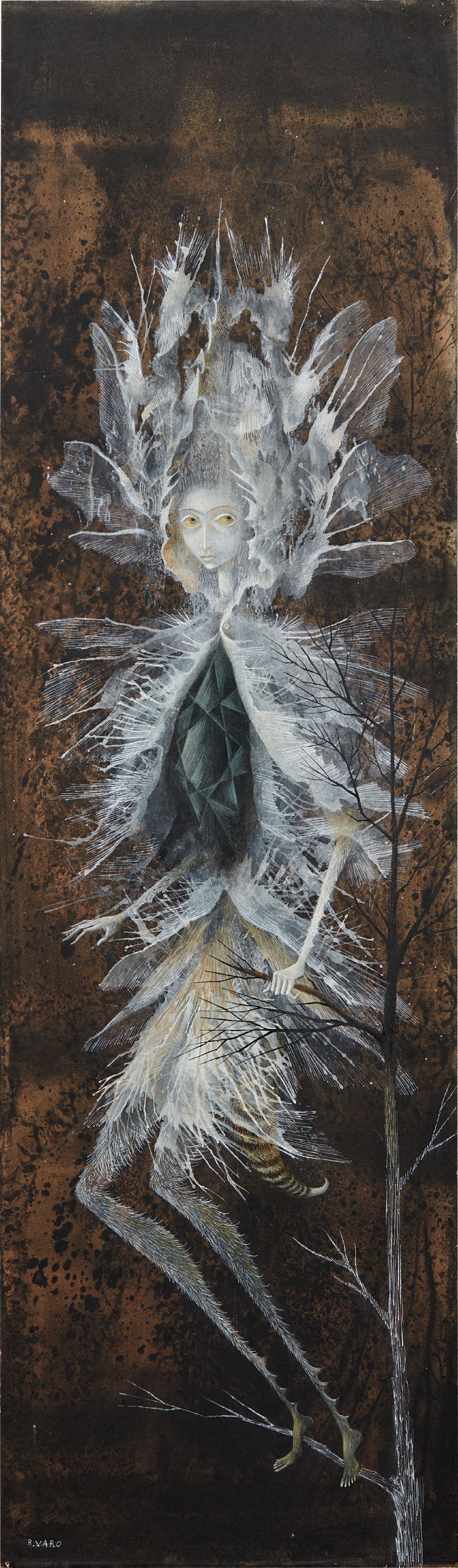 Varo’s mature work—influenced by her interest in medieval alchemy and psychoanalysis—is meticulous in execution, evincing her mastery of frottage and decalcomania, traditional Surrealist techniques. Her paintings also show influence of old masters, such as Hieronymous Bosch, El Greco, and Francisco Goya, demonstrating a complex understanding of art history as well as avant-garde styles. When she arrived in Mexico, Varo quickly became close with a thriving community of expatriate artists, such as Leonora Carrington, Wolfgang Paalen and Alice Rahon. She also began incorporating the magical syncretism and mystical energy of the fantastic—ancient beliefs that were embedded in ancient indigenous Mexican culture—into her body of work. By both physically and metaphorically distancing herself from the French Surrealism—whose rules imposed strict limits on women—Varo no longer feared being labeled the “femme fatale” and could freely explore new terrain in her art. As an expatriate, she was not tied to European or Mexican conventions, allowing to explore her inner self in a much more intimate way. One of her most important contributions to Surrealism was the activation of female subjects in her composition; rather than depicting women as muses or sexual objects, Varo’s female characters confidently explore new worlds, making scientific discoveries and accomplishing other complex tasks. The present work, La libélula (Dragonfly Woman, circa 1961, is a prime example of her work, depicting an exquisitely painted female figure at the forefront of the picture plane staring directly out at the viewer with confidence and authority, thus showcasing her power and authority.