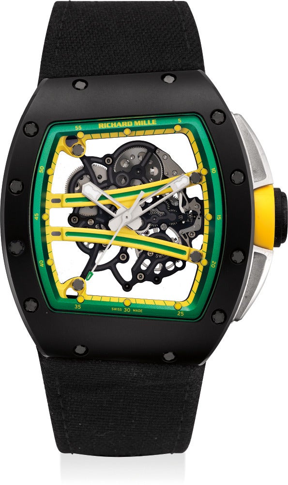 The present watch, the RM61-01 is made from Ceramic, and like its predecessor is lightweight with flying bridges in the colors of the Jamaican team. The TZP black ceramic is composed from Zirconium and the stabilizing agent Yttrium, and therefore light and durable. The caseband is made from NTPT carbon a multi-layered fiber impregnated with resin and heated under pressure. The asymmetrical case is meant to be aerodynamic like the sprinter, and the skeletonized case allows one to see the intricate movement. In excellent overall condition, the present watch is sure to be a fan of the Richard Mille brand.