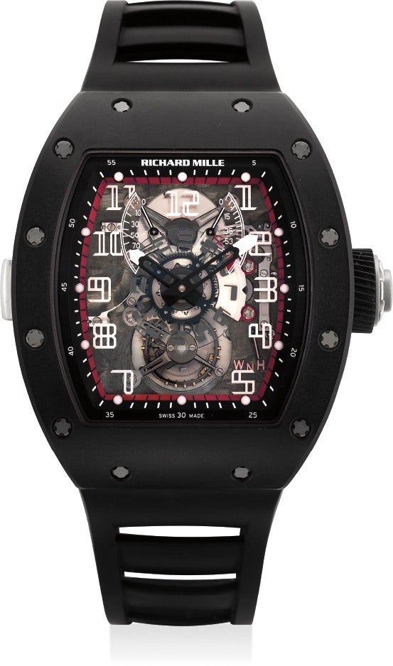Richard Mille,型號RM 003,限量版超輕碳纖維陀飛輪腕錶,配雙時區、發條扭矩指示器、錶冠功能轉換裝置、和碳納米纖維鏤空基板,限量發行5枚,編號第2號,約2014年製。附錶盒和保證書
