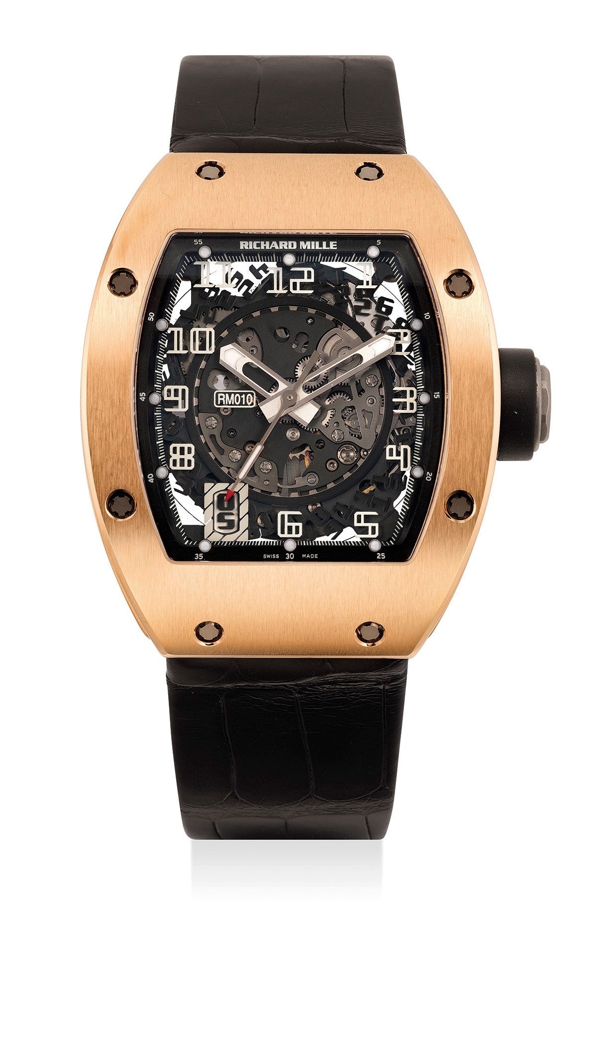 Richard Mille,型號RM 010,罕有,18K玫瑰金酒桶形鏤空腕錶,配日期顯示,約2007年製。附錶盒、保證書和配件