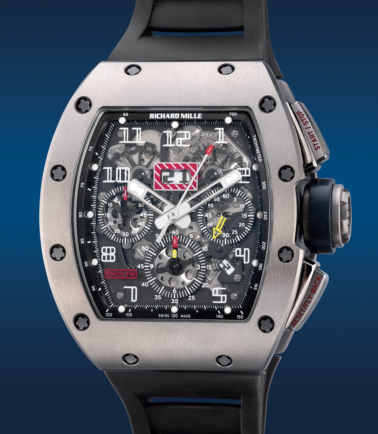 The RM011 featured a self-winding movement made by Vaucher and its flyback chronograph mechanism by Dubois-Dépraz, a trusted name in the industry. Housed inside its signature tonneau-shaped grade 5 titanium case, the construction of the case took over 202 different machine procedures to execute with the help of analytical engineering methods used inspired by Formula 1 racing.