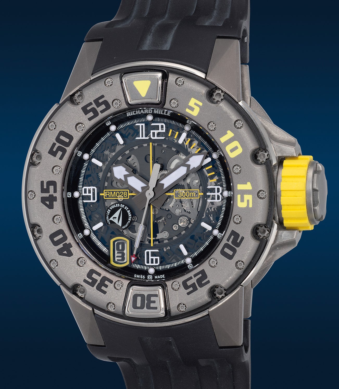 Released in 2010, the current edition of the RM 028 holds particular significance as it celebrates Richard Mille's sponsorship of the international yacht race Les Voiles de St Barth, held in the Caribbean waters surrounding St Barth. As their first collaboration, a limited edition of 100 pieces was produced. The watch is further distinguished by the use of vibrant yellow, a color commonly associated with diving and sailing, which is showcased on the rubber portion of its crown and the elapsed dive time scale markings on its diver's bezel.