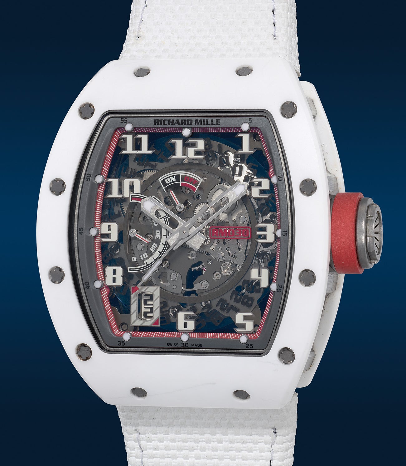Richard Mille,「RM030, Japan Edition」型號RM030 Ti-ATZ,十分精美罕有,限量版白色ATZ陶瓷及鈦金酒桶形自動鏤空腕錶 ,備日期、上鏈指示、動力儲存顯示,為日本市場限量發行50枚,約2017年製。附原裝證書、錶盒