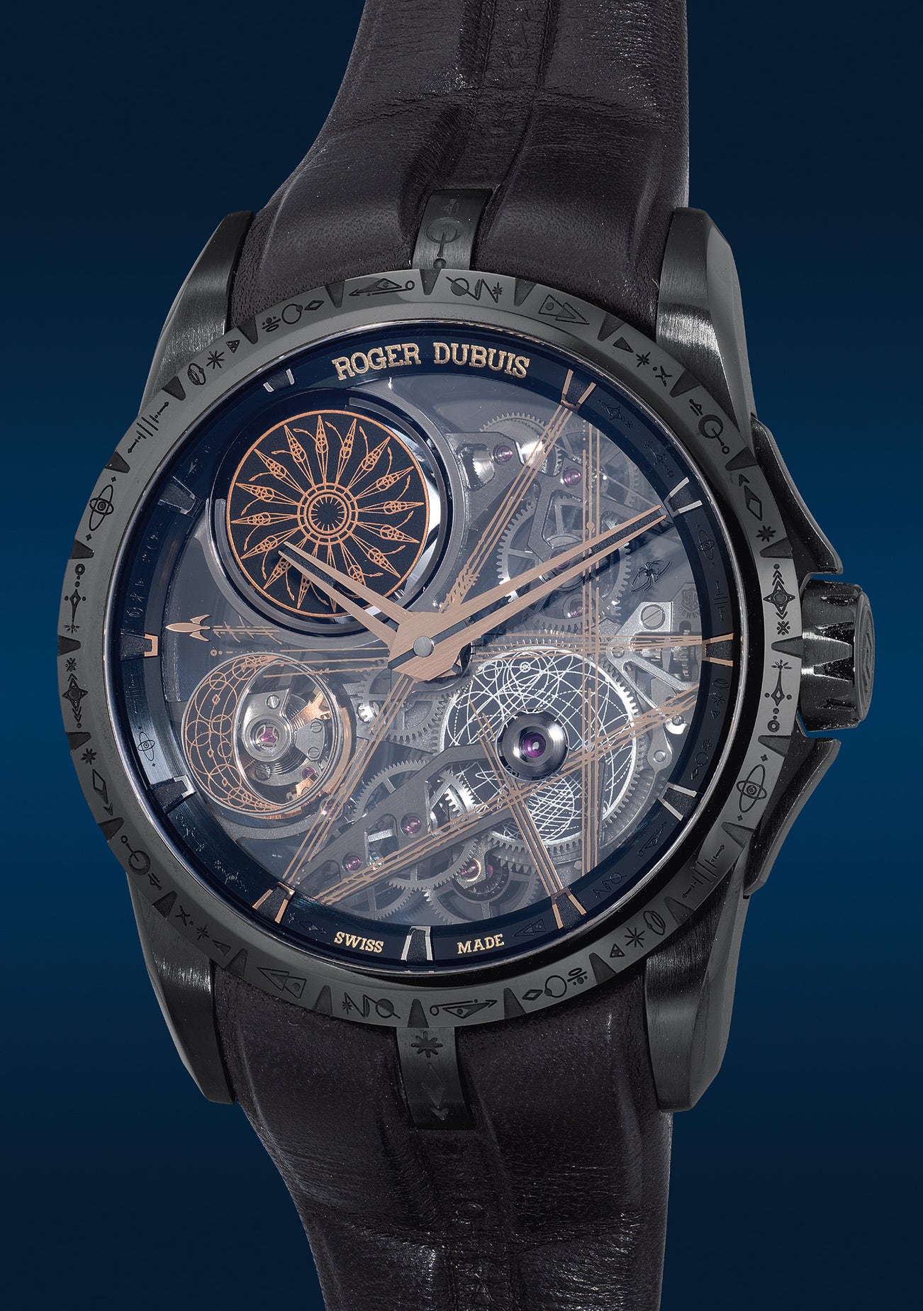 The present watch is fitted with a black Roger Dubuis signature double surface flange with engraved symbols and transferred texts in pink gold, complementing the delicate pink gold coated graphics depicting the sun, moon and star on the skeletonised dial. For Dr. Woo, the spider motif symbolizes power and protection, and it has been a constant in his designs. The spider symbol at 2 o’clock is a nice detail completing the overall design. Bearing the Geneva Seal on the movement, the present timepiece is powered by the in-house calibre RD720SQ which boasts a power reserve of up to 72 hours, and runs with an increased precision of 4Hz frequency.