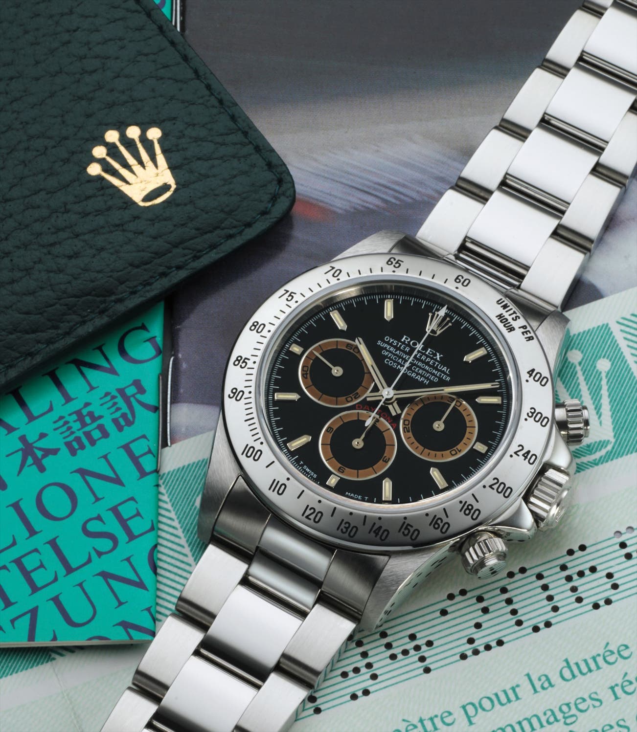 Today, the Zenith Daytona has become an incredibly collectible watch. The present example, preserved in excellent condition, has probably been worn a few times only and even carries the original factory sticker to the caseback. The registers have turned "tropical" over time, displaying an intense warm chestnut hue. It is furthermore presented with its original punched guarantee and product literature to delight the scholar and collector.