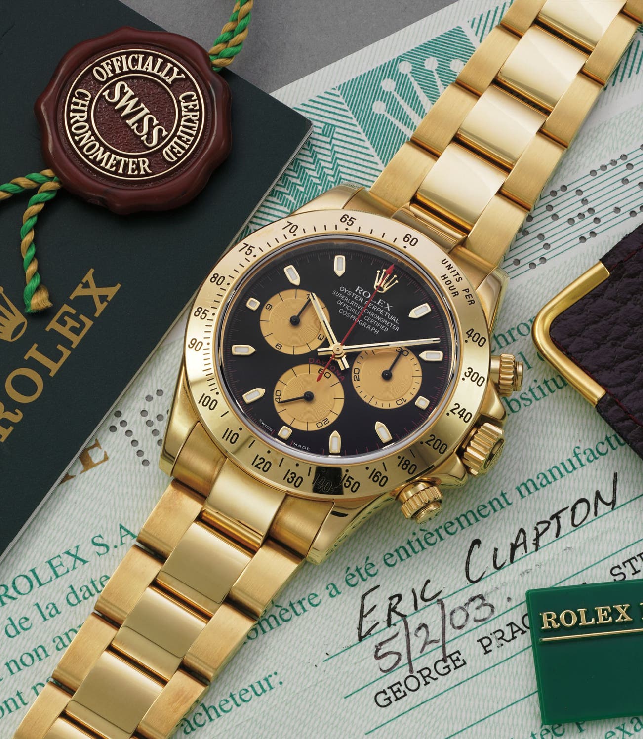 The present watch is accompanied by its original punched guarantee, stating the watch was purchased by Sir Eric Clapton on February 5, 2003, at George Pragnell in Stratford-Upon-Avon. This is confirmed by the punched country code on the guarantee, 160, for the United Kingdom.