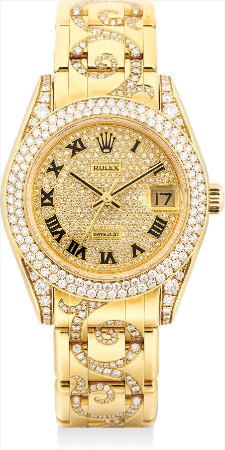 勞力士,精細及罕有,18K黃金鑲鑽石,女裝自動上弦鏈帶腕錶,配中心秒針及日曆顯示,“Pearlmaster”,型號81358,約2007年製