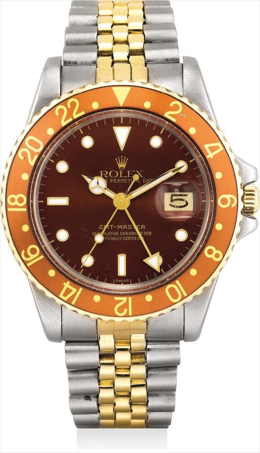 勞力士,精細,18K黃金及不銹鋼自動上弦鏈帶腕錶,配兩地時間、中心秒針及日曆顯示,“GMT-Master”,型號16753,約1981年製
