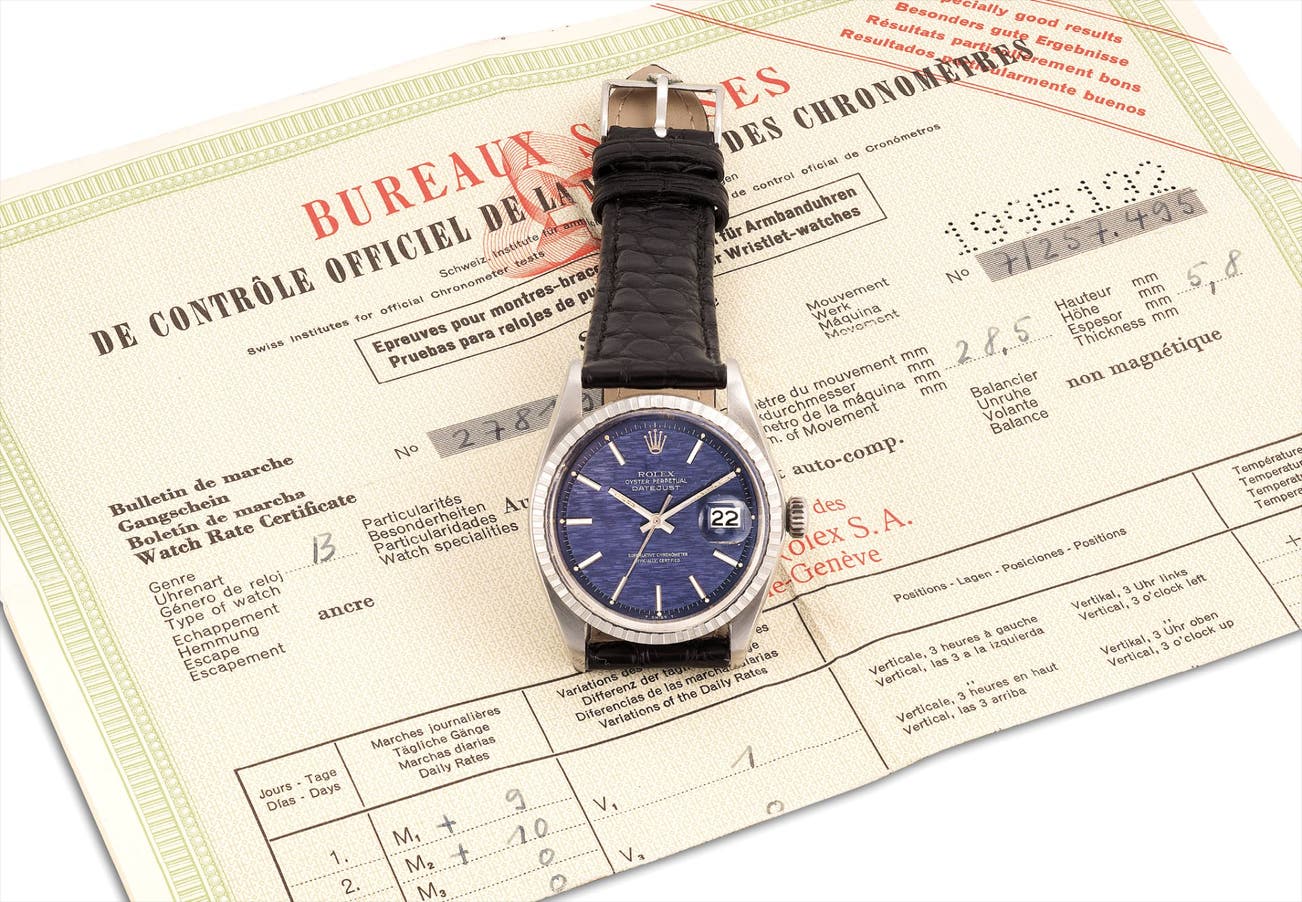 勞力士,不銹鋼自動上弦腕錶,配中心秒針、日曆顯示、藍色錶盤及天文台認證,“DateJust”,型號1603,約1968年製