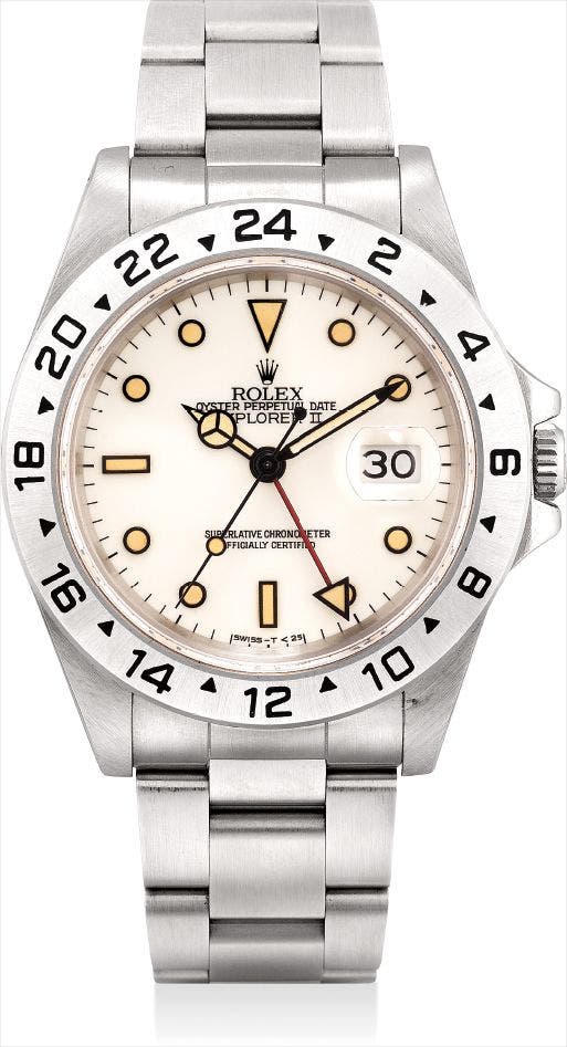 勞力士,不銹鋼自動上弦鏈帶腕錶,配兩地時間、中心秒針及日曆顯示,“Explorer II”,型號16570,約1991年製
