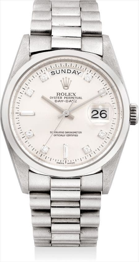 勞力士,精細及罕有,鉑金鑲鑽石自動上弦腕錶,配中心秒針、星期及日曆顯示,“Day-Date”,型號18206,約1997年製
