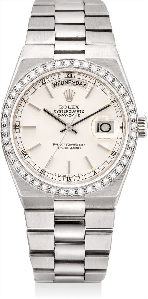 勞力士,精細及罕有,18K白金鑲鑽石,石英鏈帶腕錶,配中心秒針、星期及日曆顯示,“Oyster Quartz Day-Date”,型號19049,約1984年製