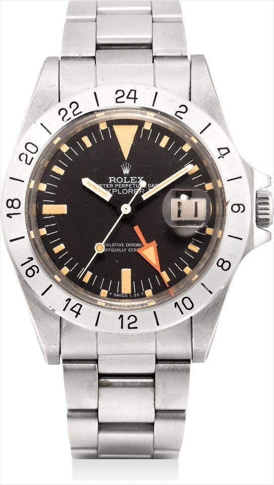 勞力士,精細及罕有,不銹鋼自動上弦鏈帶腕錶,配兩地時間、中心秒針及日曆顯示,“Explorer II Steve McQueen”,型號1655,附證書及收據,約1984年製