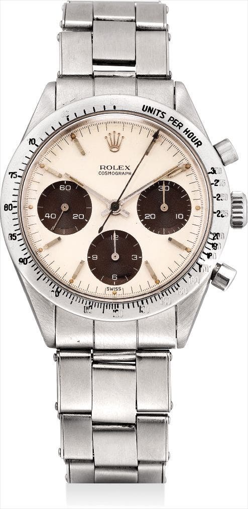 勞力士,精細及罕有,不銹鋼鏈帶腕錶,配計時功能及棕色子盤,“Cosmograph”,型號6239,附證書,約1963年製