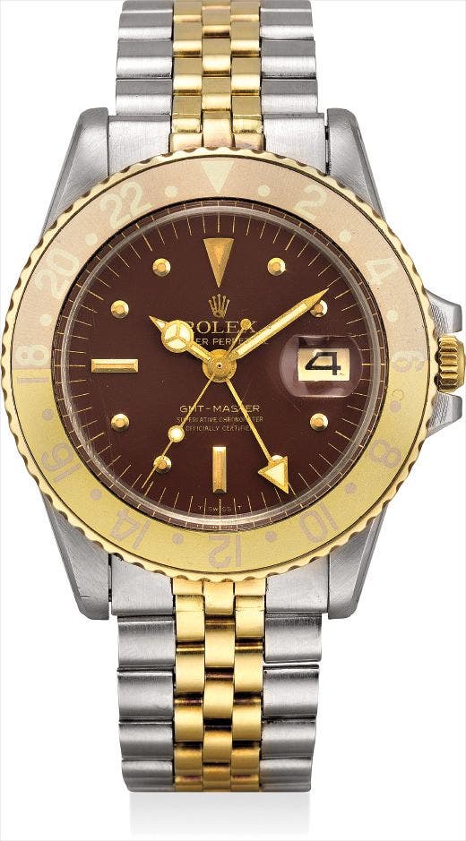 勞力士,18K黃金及不銹鋼,自動上弦鏈帶腕錶,配兩地時間、中心秒針及日曆顯示,“GMT-Master”,型號1675,約1972年製