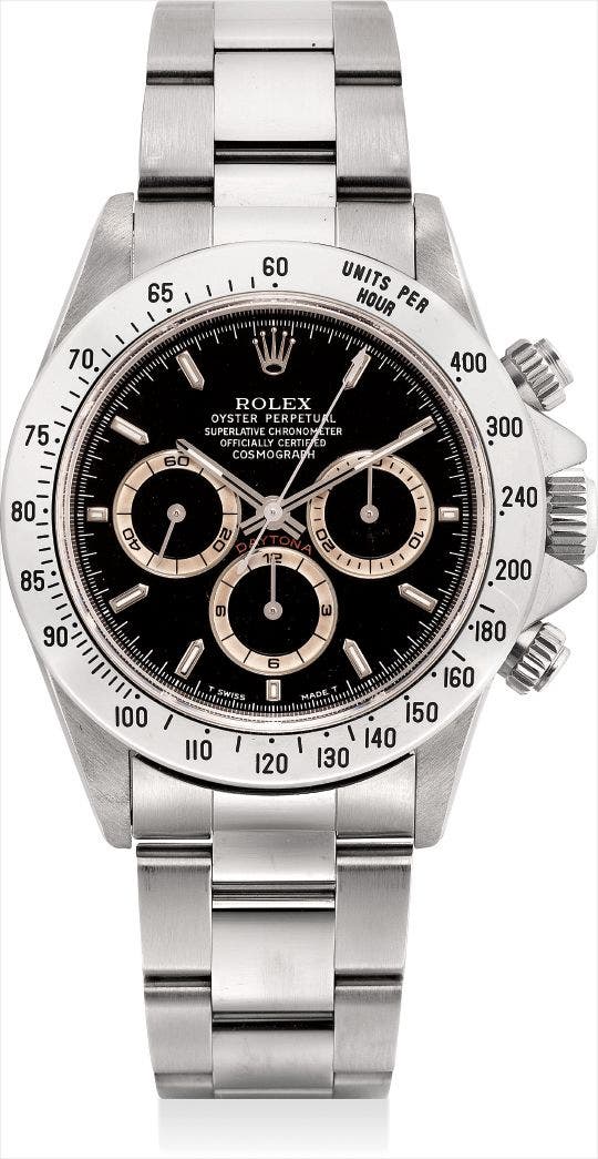 勞力士,精細及罕有,不銹鋼自動上弦鏈帶腕錶,配計時功能及棕色子盤,“Cosmograph Daytona”,型號16520,附證書及盒子,約1996年製
