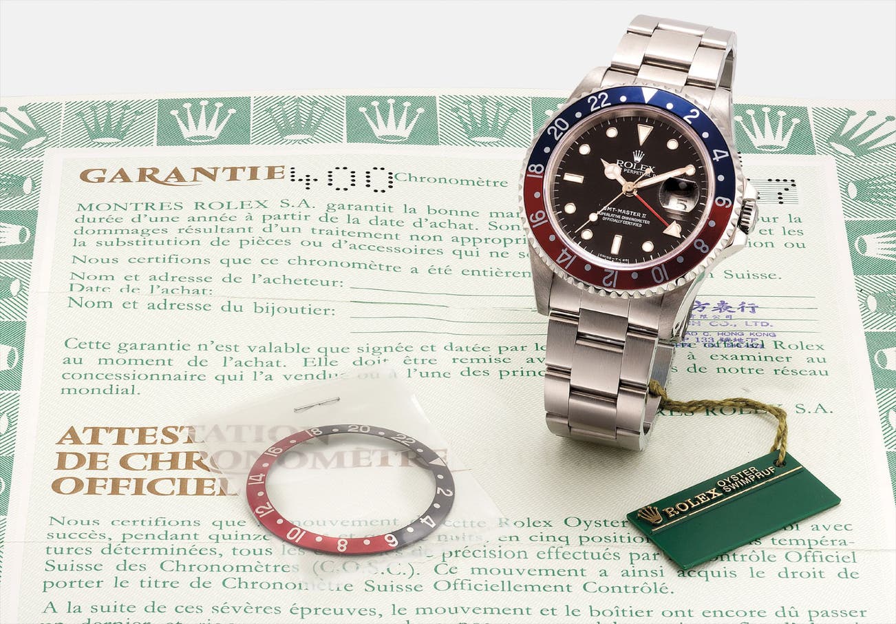 勞力士,不銹鋼自動上弦鏈帶腕錶,配兩地時間、中心秒針及日曆顯示,“GMT-Master II,”,型號16710,附證書,約1991年製